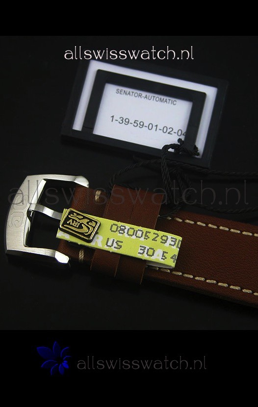 Genuine Brown Leather Strap complete with Glashuette Markings and Engravings with Steel Tang Buckle.