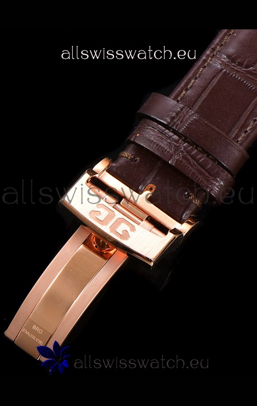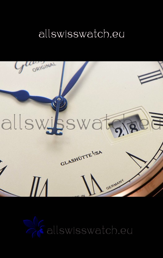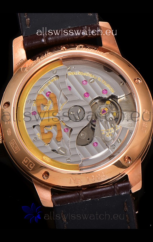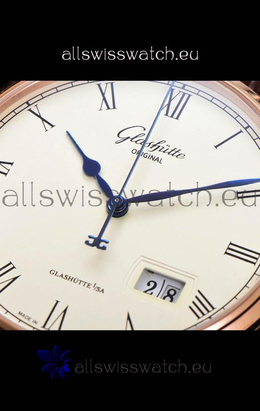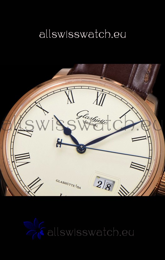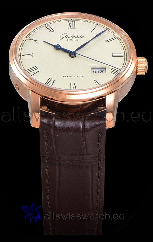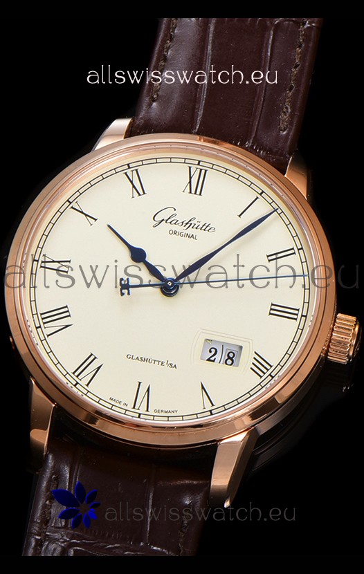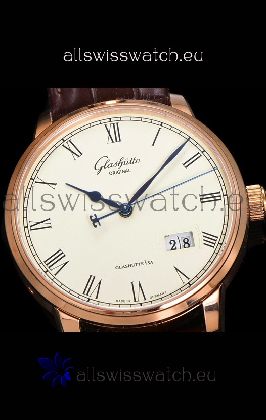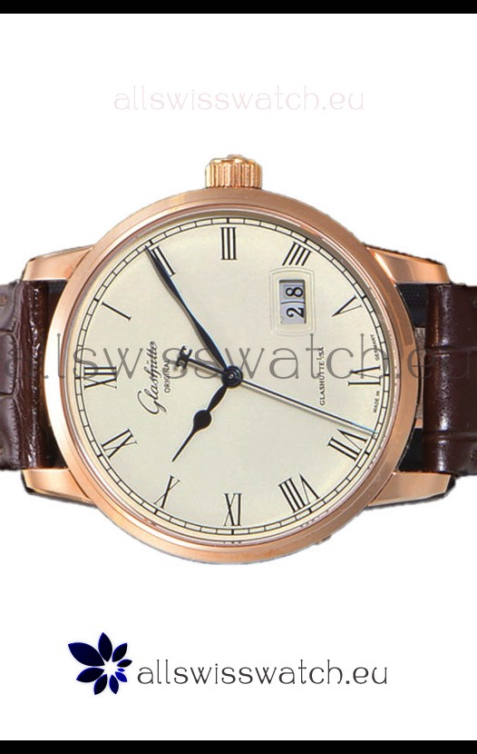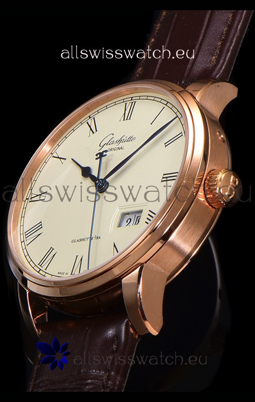 18K Rose Gold Plating on 904L Stainless Steel Polished Casing complete with Glashuette Markings and Engravings