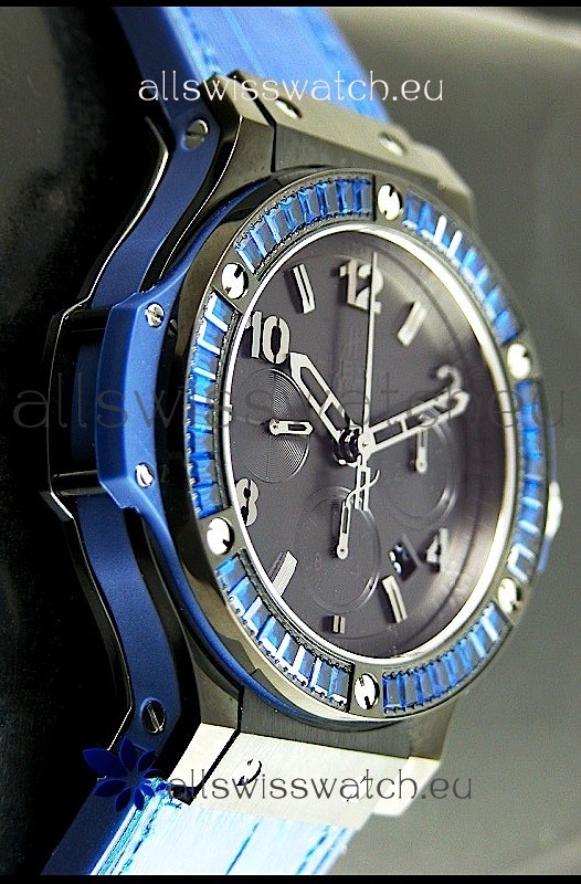 Watch name: Hublot Big Bang All Black Edition in Purple Strap and Baguette Diamonds Bezel
