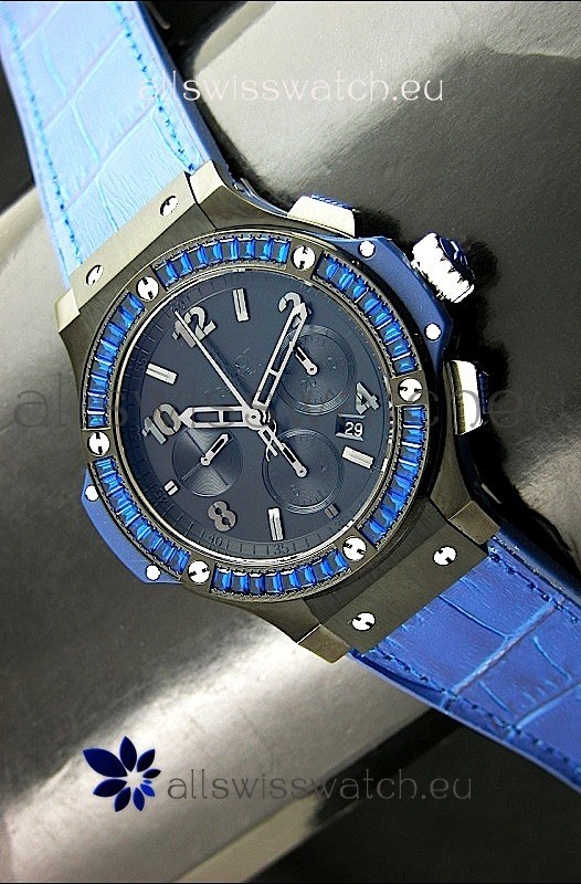 Other Feartures: Fine Quality Blue Square Cut Diamonds Crested, Transparent Saphire Glass and Pusher Button at 2:00 Starts/Stops Chronograph