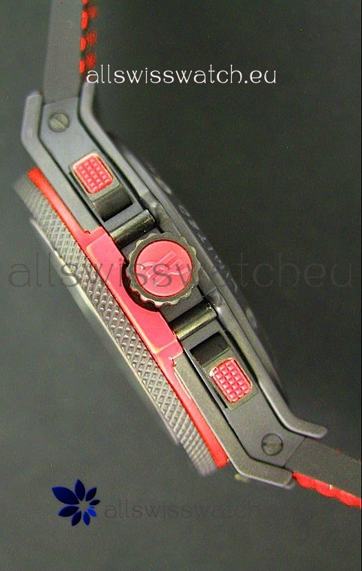 Function: Hour, Minute, Second, Date Display at 4:30, Red Raise Steel Batton Hour Markers, Red Minute, Three Functional Subdials and Fully Functional Chronograph