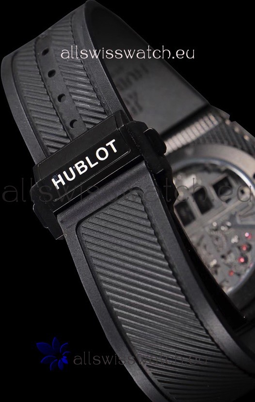 Genuine Rubber Clad strap with PVD Coated Clasps complete with Hublot Markings and Engravings.