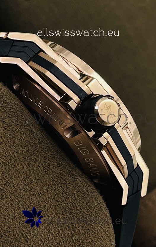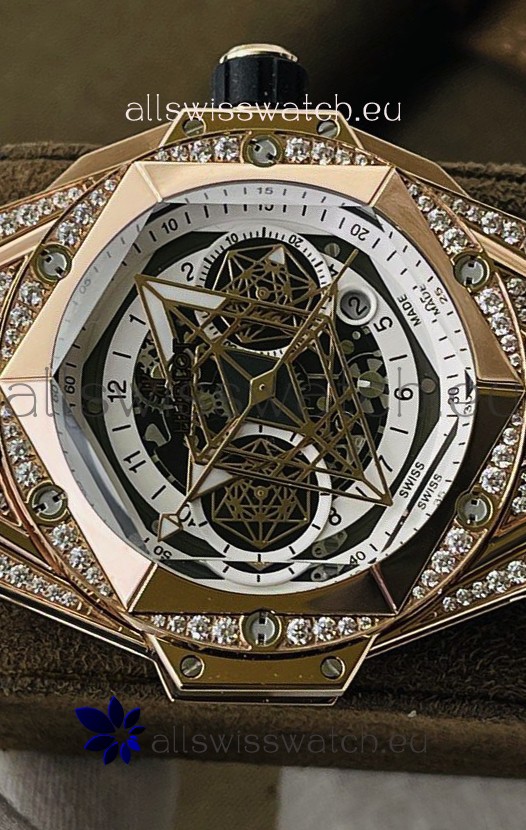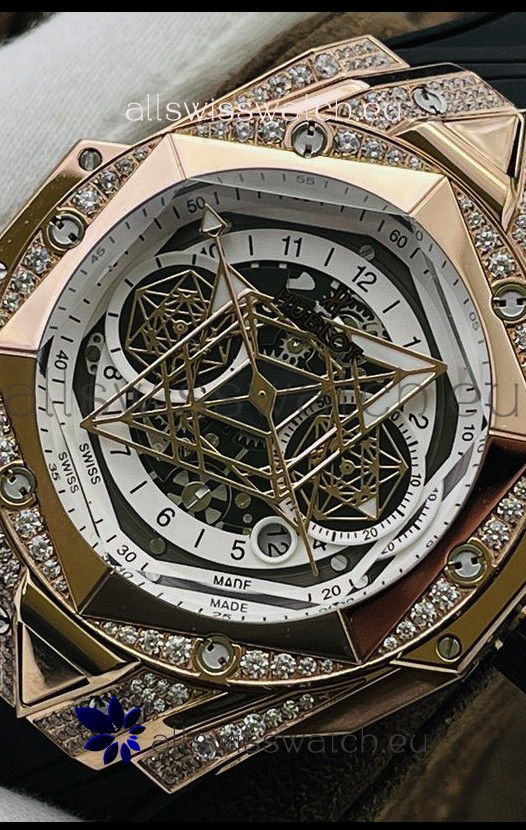 18K Rose Gold Plating with Diamonds Encrusted on 904L Stainless Steel Casing in Geometric Form, one of the the most advanced watch casing production technique on a Replica watch to give it a 1:1 mirror Look.