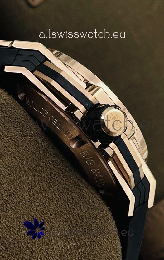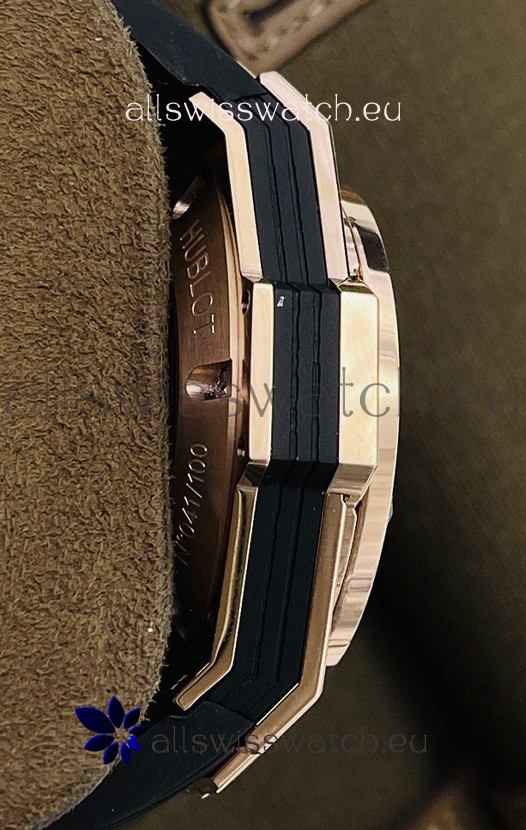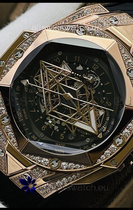 18K Rose Gold Plating with Diamonds Encrusted on 904L Stainless Steel Casing in Geometric Form, one of the the most advanced watch casing production technique on a Replica watch to give it a 1:1 mirror Look.