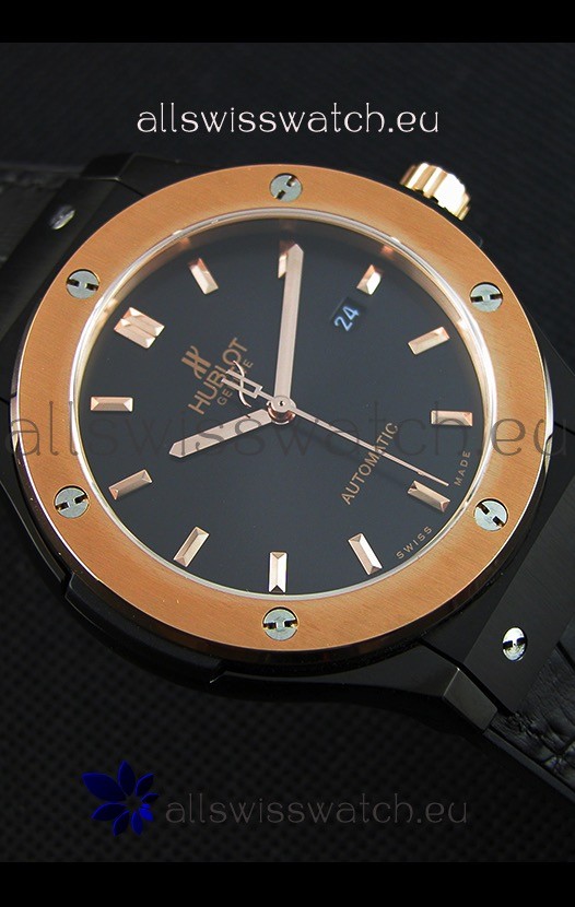 Top Grade Hublot Classic Fusion Ceramic King Gold Black Dial Swiss Replica Watch - 1:1 Mirror Replicawith Free Shipping and 1 year warranty