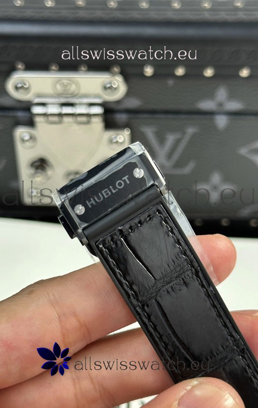 Genuine Gummy Leather Strap with Steel Folding Clasp complete with Hublot Markings and Engravings.
