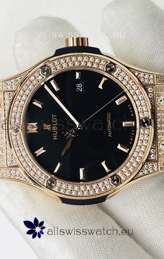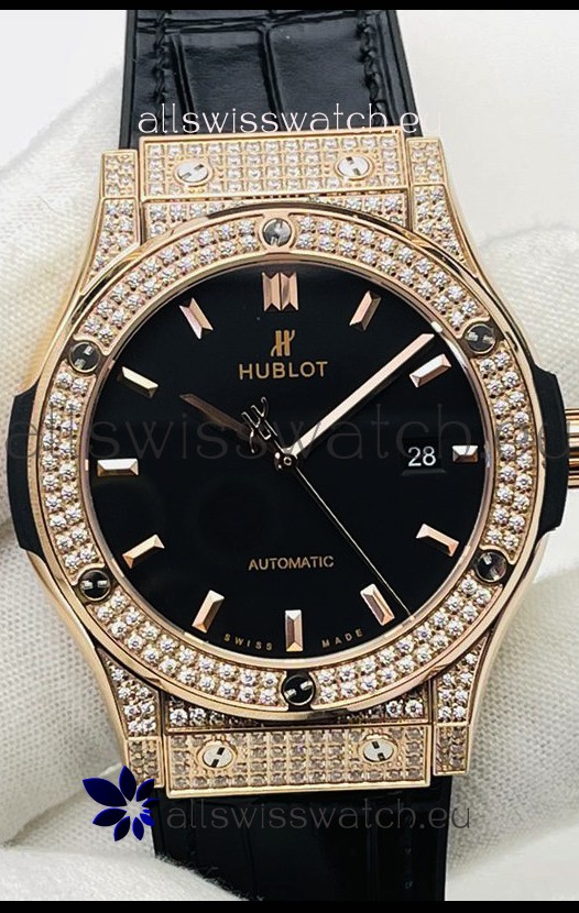 Hublot Classic Fusion Diamonds Rose Gold Black Dial Swiss Replica Watch 1:1 Mirror Quality