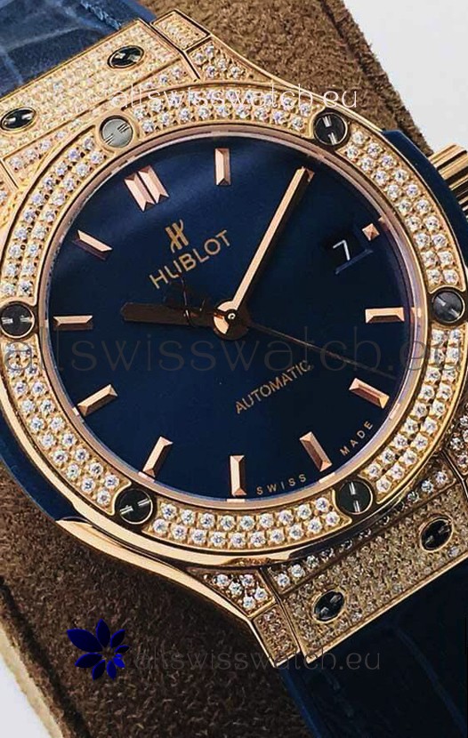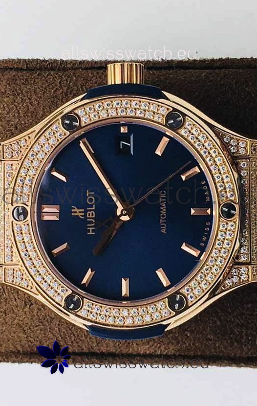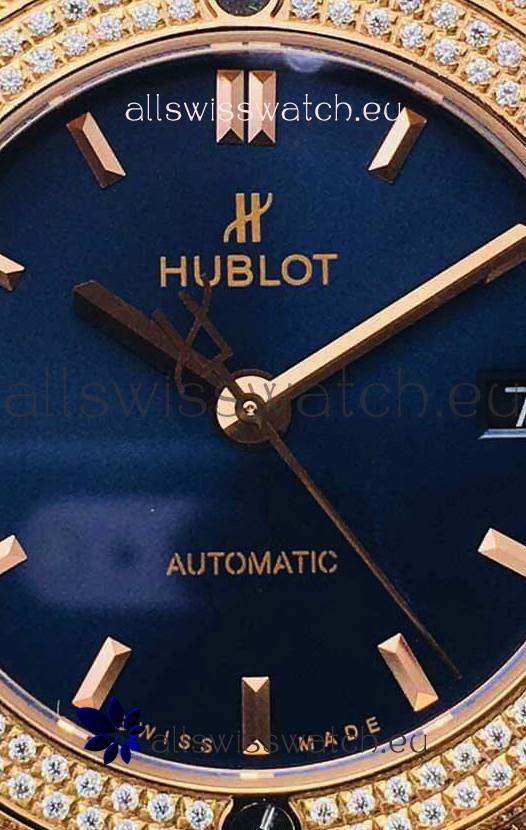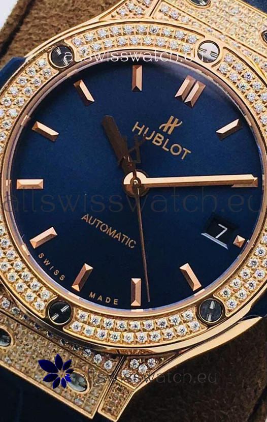 Hublot Classic Fusion Diamonds Rose Gold Blue Dial 38MM Swiss Replica Watch 1:1 Mirror Quality