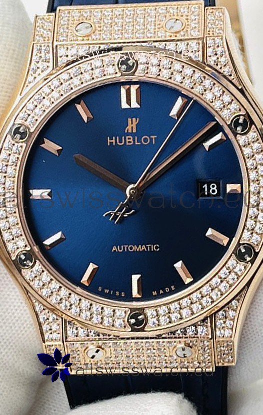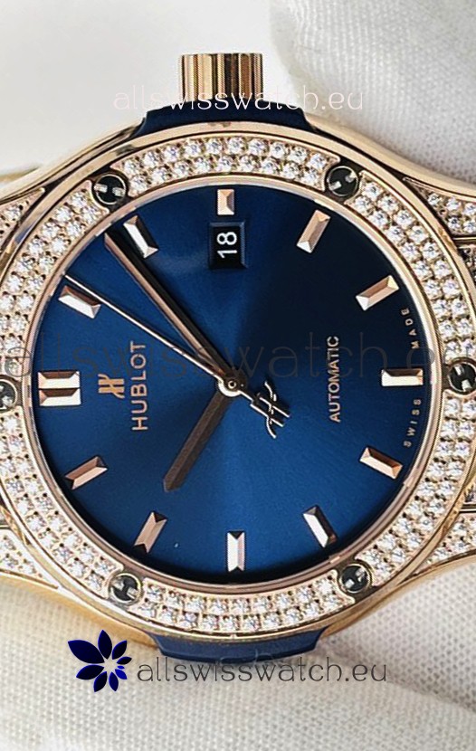 Hublot Classic Fusion Diamonds Rose Gold Steel Blue Dial Swiss Replica Watch 1:1 Mirror Quality