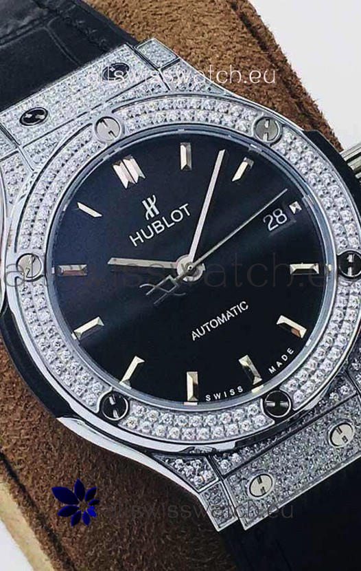 Hublot Classic Fusion Diamonds Steel Black Dial 38MM Swiss Replica Watch 1:1 Mirror Quality