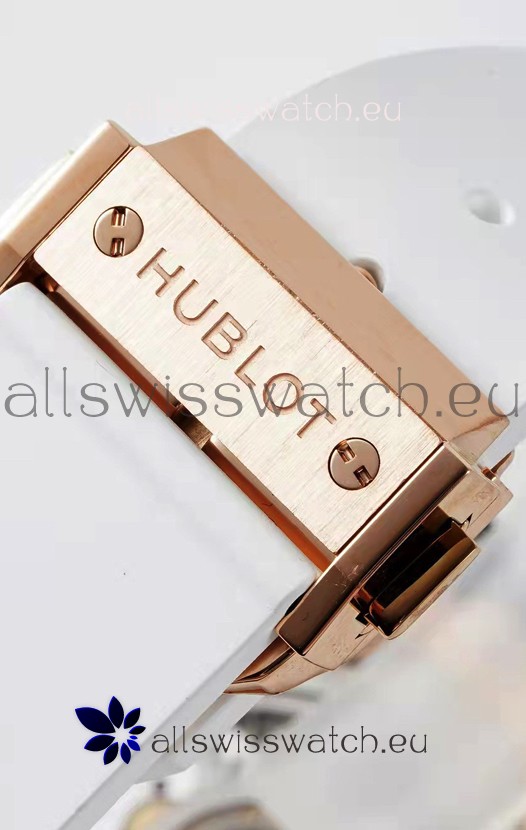 Genuine Rubber Strap with Rose Gold Plating on Steel Folding Clasp complete with Hublot Markings and Engravings.