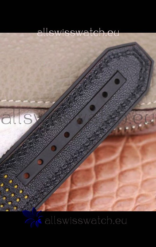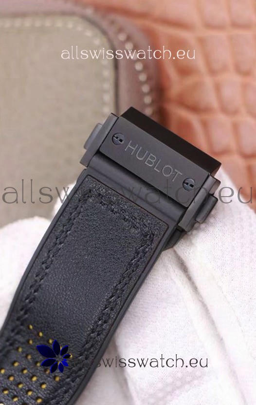 Genuine Rubber Clad strap with PVD Coated Clasps complete with Hublot Markings and Engravings.