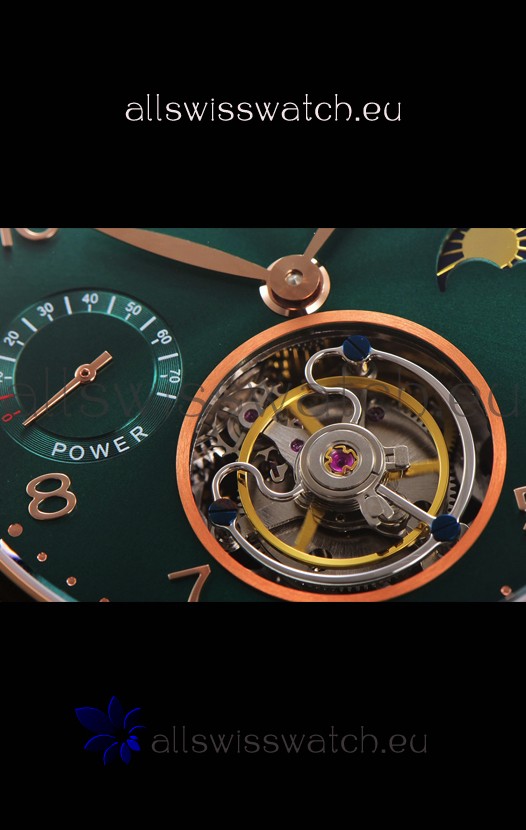 Green Dial with Power Reserve Indicator at 9O'Clock, MoonPhase Indicator functioning as Day/Night Counter at 3 O'Clock and Tourbillon located at 6 O'Clock on Dial