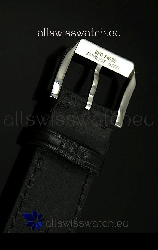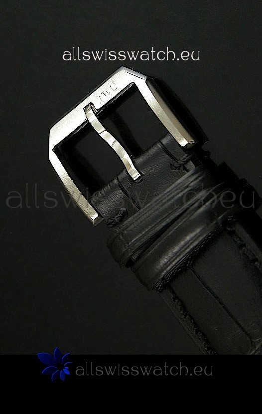 Genuine Black Leather Strap with IWC Markings and Engravings with Tang Stainless Steel Buckle