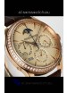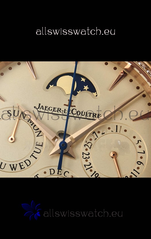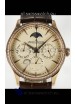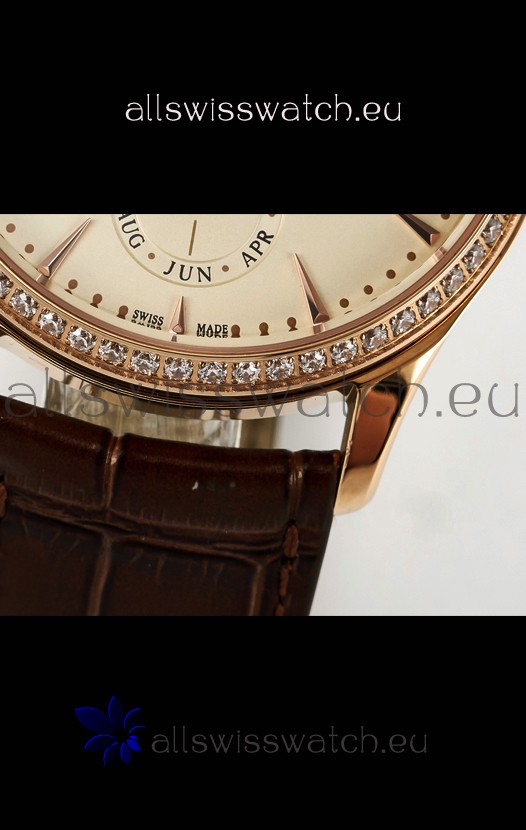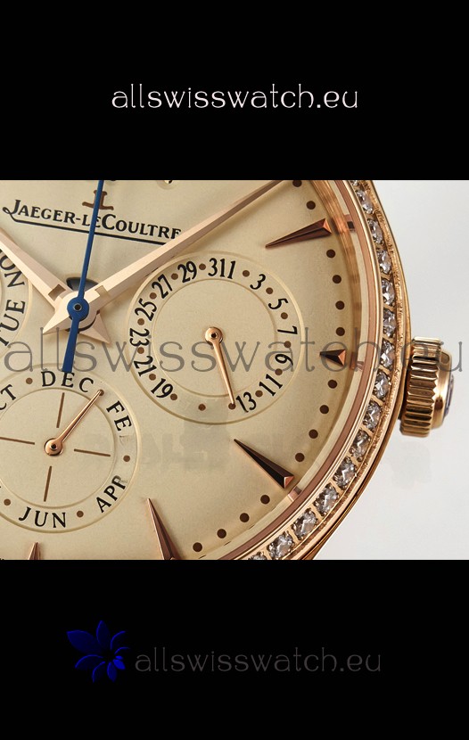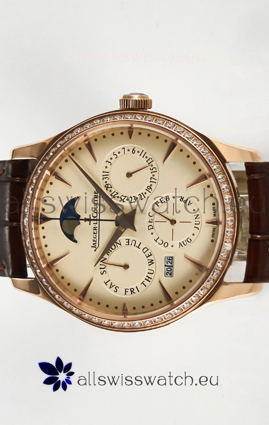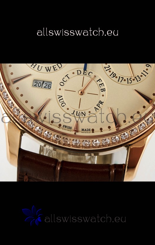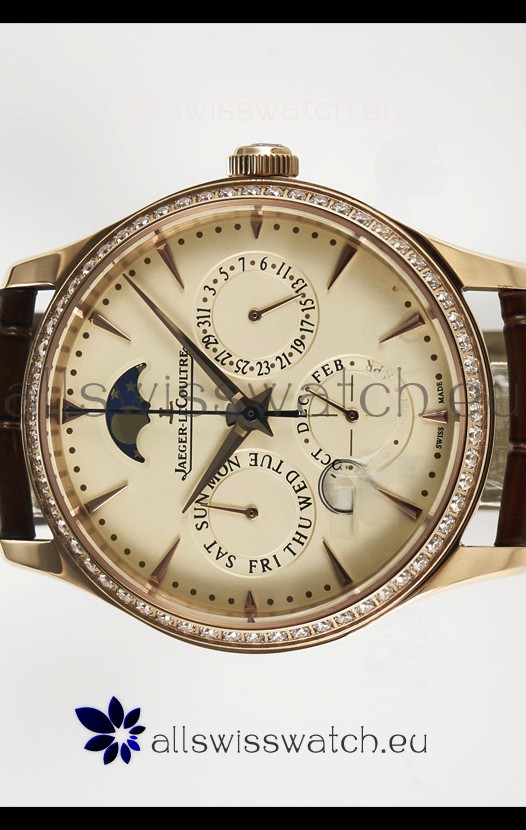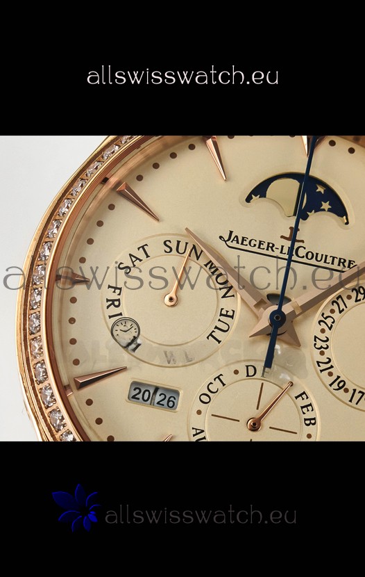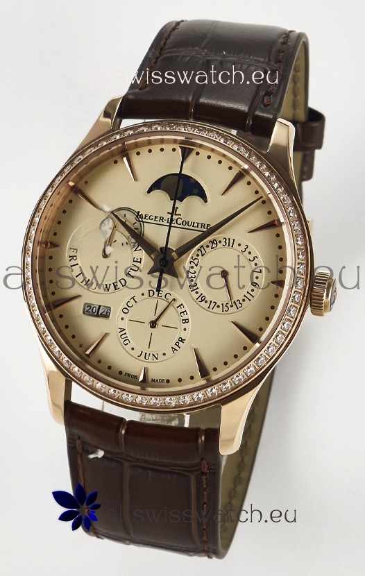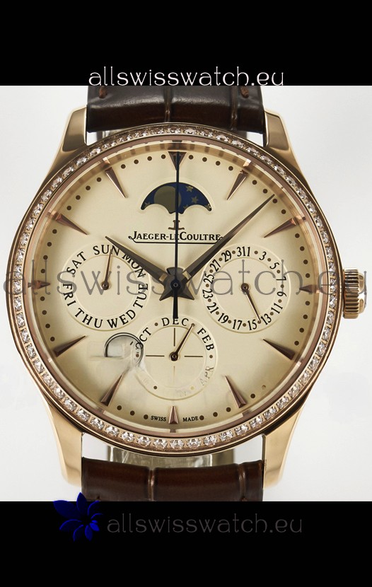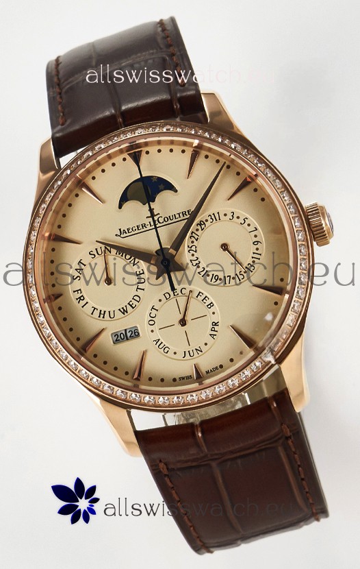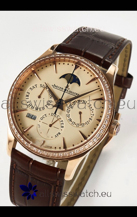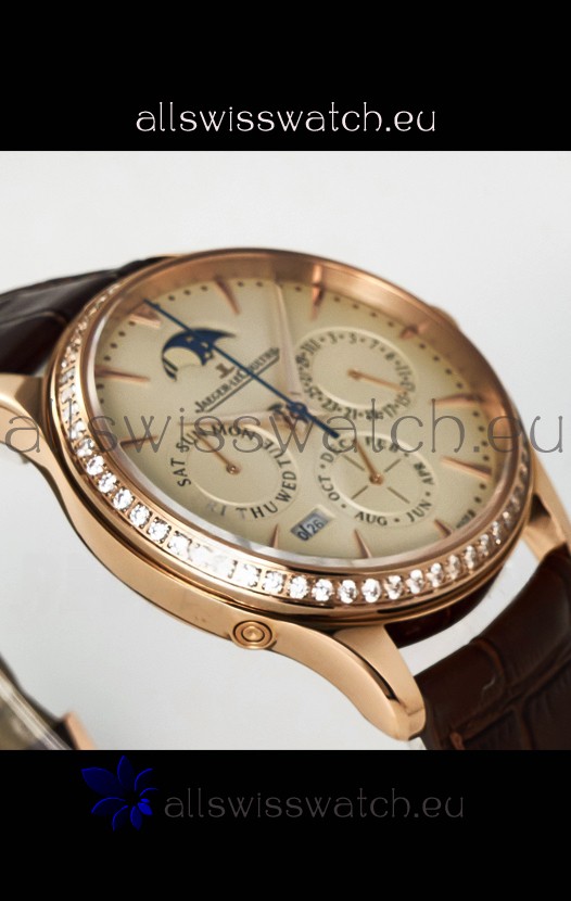 Jaeger LeCoultre Super Clone Master Ultra-Thin Perpetual Calendar Cream Dial Diamonds Bezel Watch