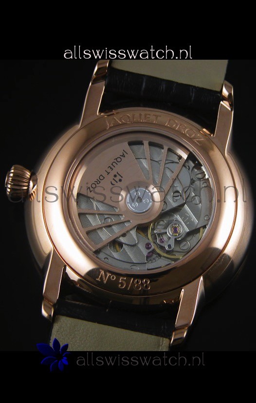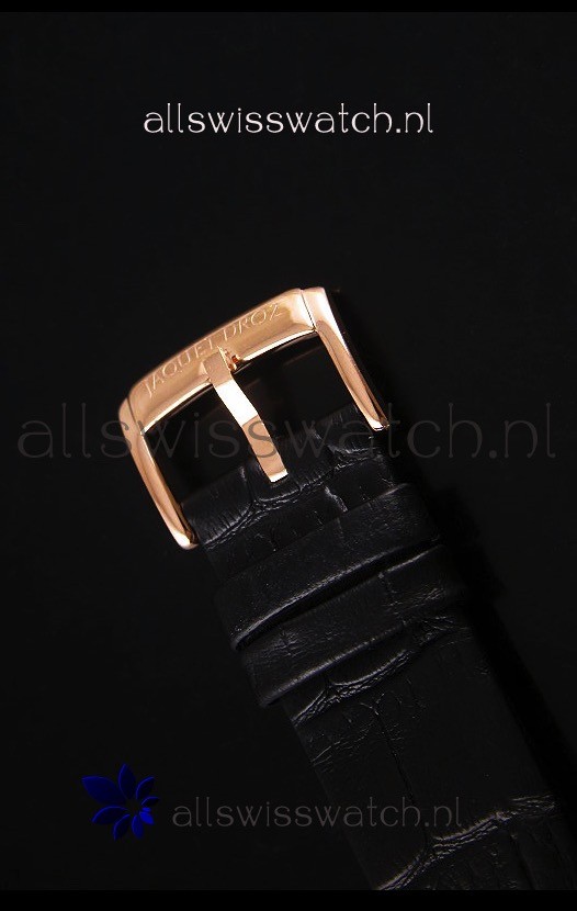 Black Leather Strap with 18K Rose Gold Tang Buckle complete with Jaquet Droz Markings