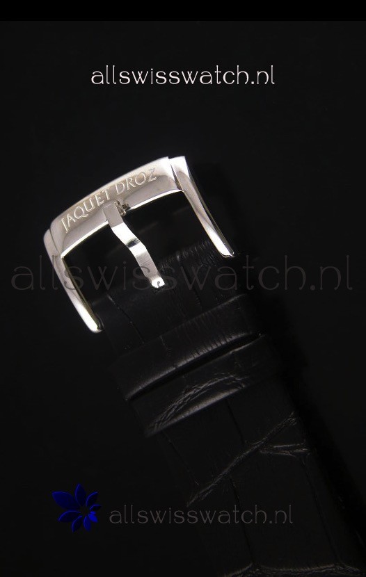 Black Leather Strap with Steel Tang Buckle complete with Jaquet Droz Markings