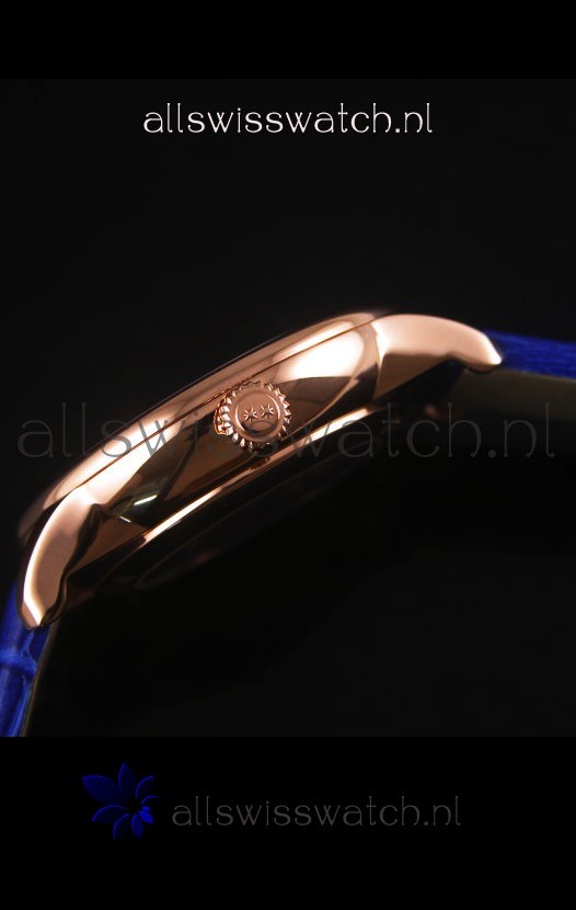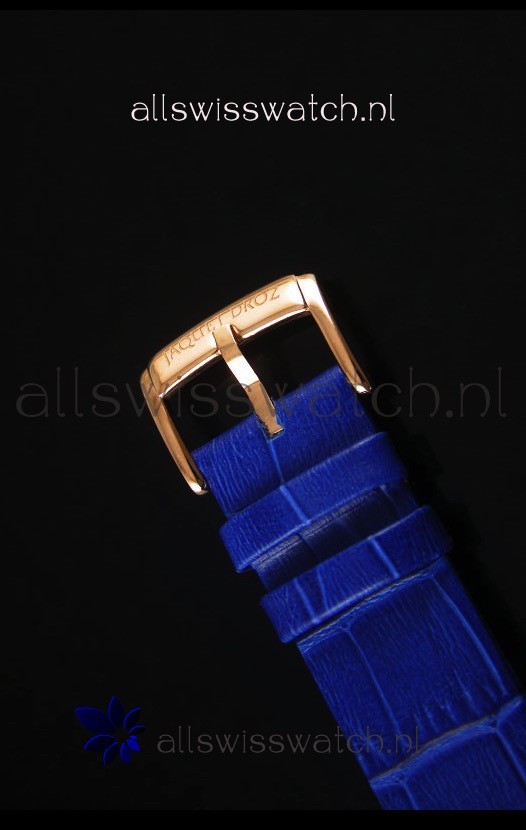 Blue Leather Strap with 18K Rose Gold Plated Tang Buckle complete with Jaquet Droz Markings