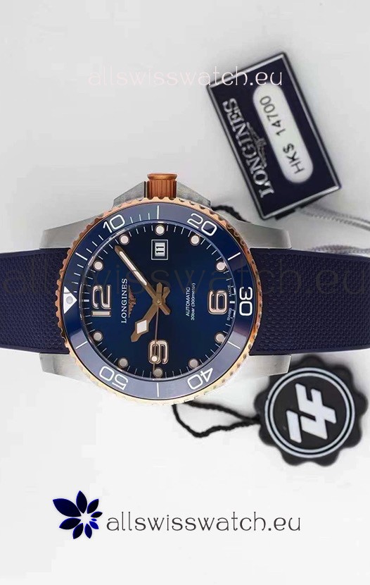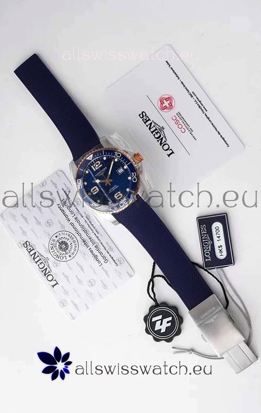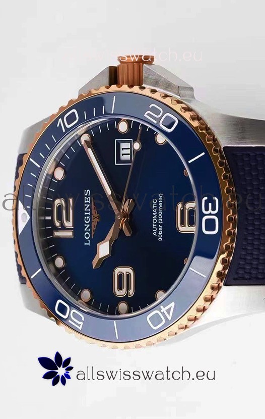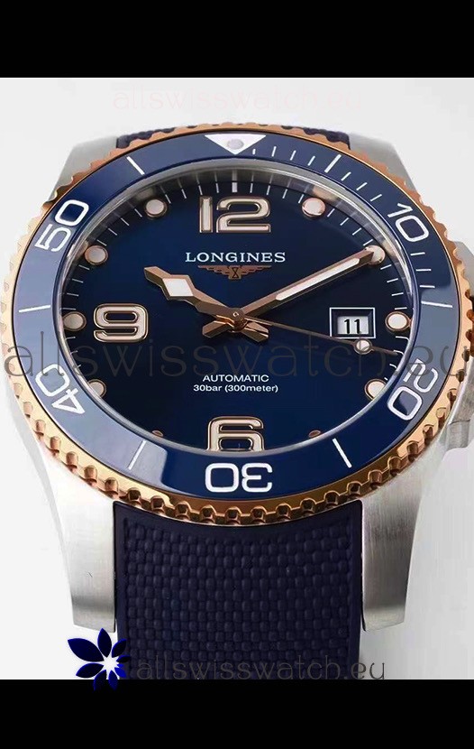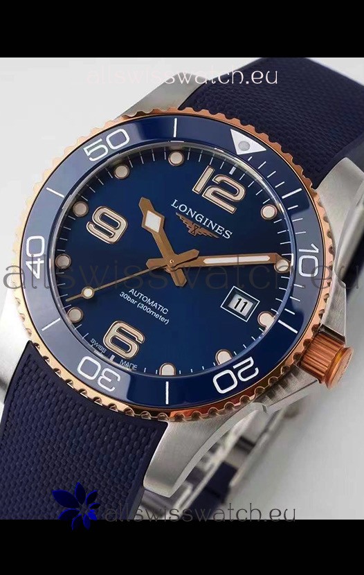 Longines HydroConquest 1:1 Swiss Replica Watch in Blue Dial Rubber Strap Rose Gold Bezel