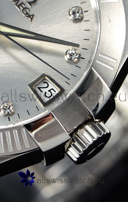 Steel Dial with Diamonds Hour Markers and Date Window at 3 O'Clock. Long Seconds hands almost touching the Corners as per the Genuine