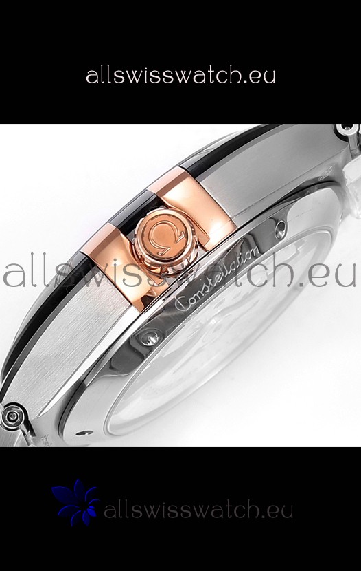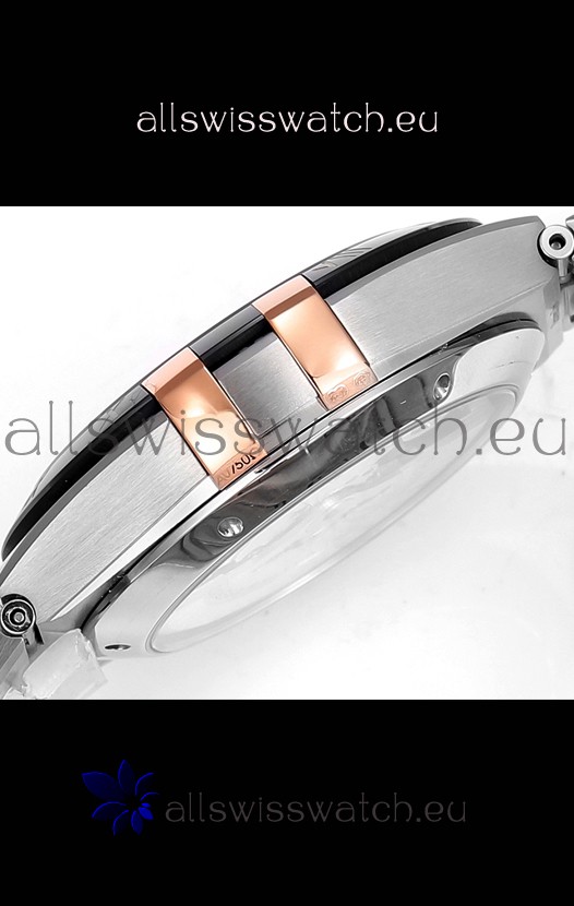 Rose Gold Two Tone Plating on 904L Stainless Steel Case complete with Omega Markings and Engravings. Ceramic Bezel