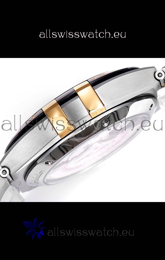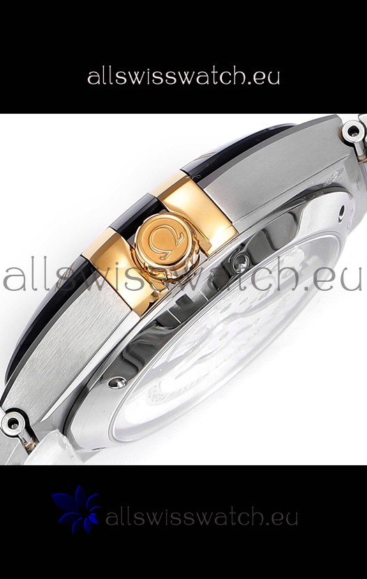 Rose Gold Two Tone Plating on 904L Stainless Steel Case complete with Omega Markings and Engravings. Ceramic Bezel