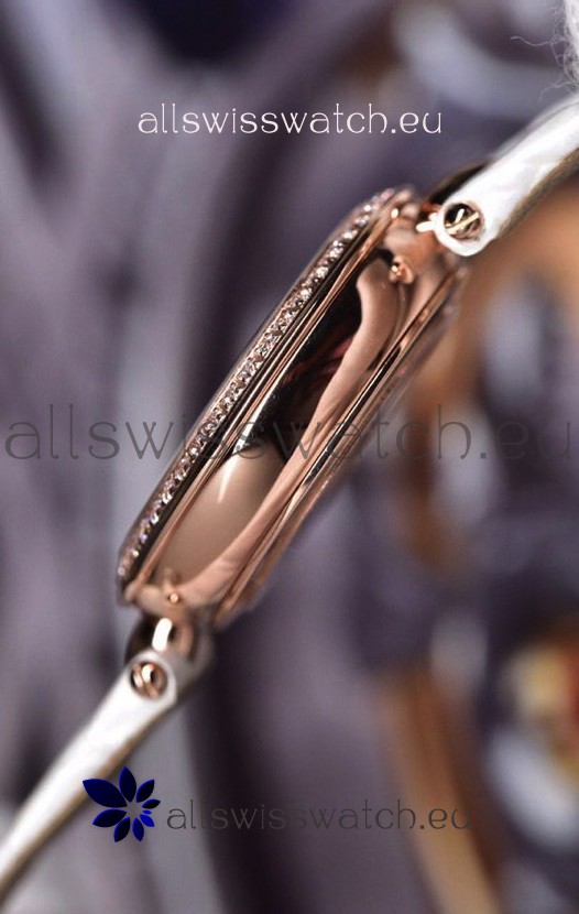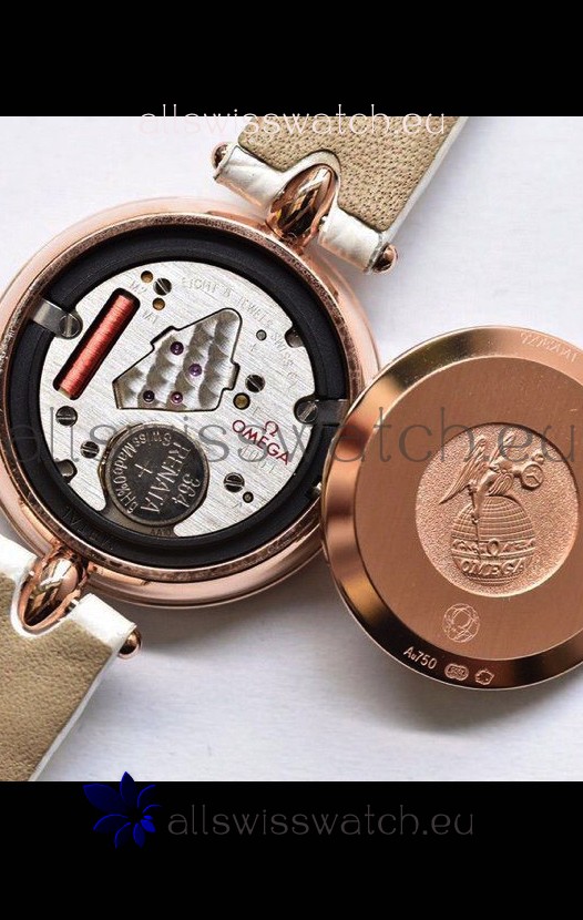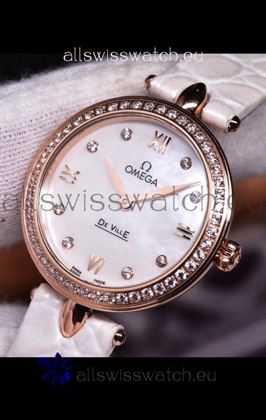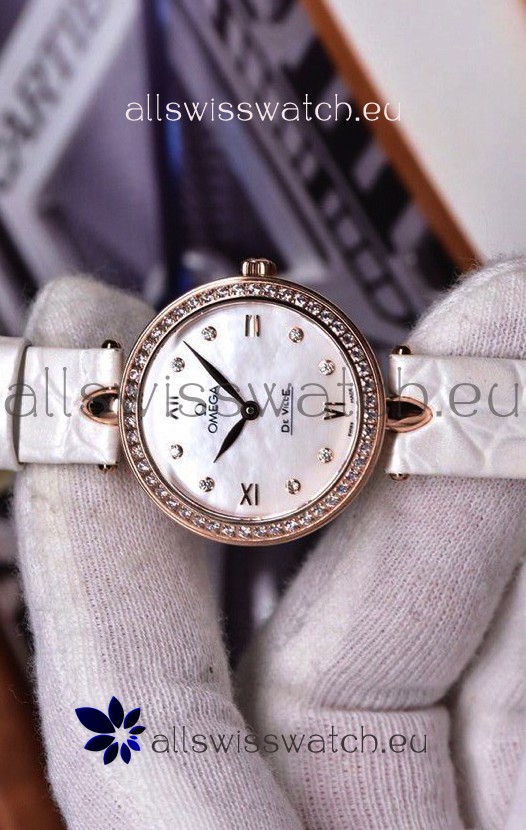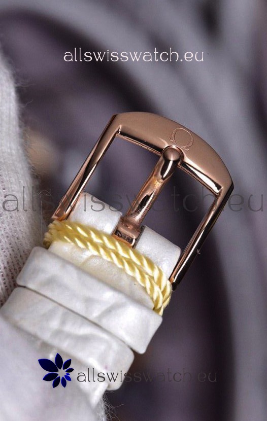 Omega De Ville Prestige Dewdrop Edition Swiss Quartz Watch in Rose Gold White Strap