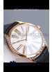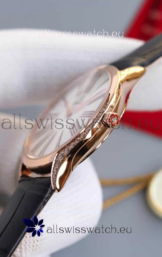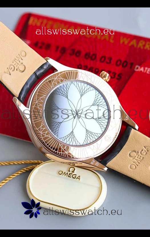18K Rose Gold Plating on 904L Stainless Steel Case complete with Omega Markings and Engravings as per the originals. High Quality Diamonds Bezel