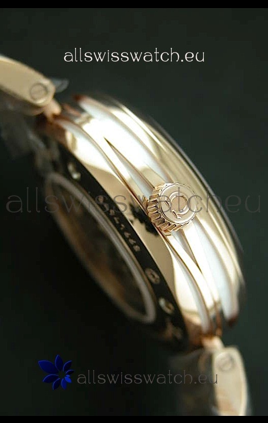 Other Feartures: Smooth Polished 18K Rose Gold Bezel, Display Case Back with Detailed Serial Engraving and Genuine Sapphire Crystal like Authentics
