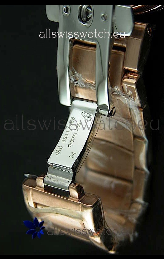 Strap: 18K Rose Gold Plated Link Bracelet with Double Fold Insignia Deployant Buckle
