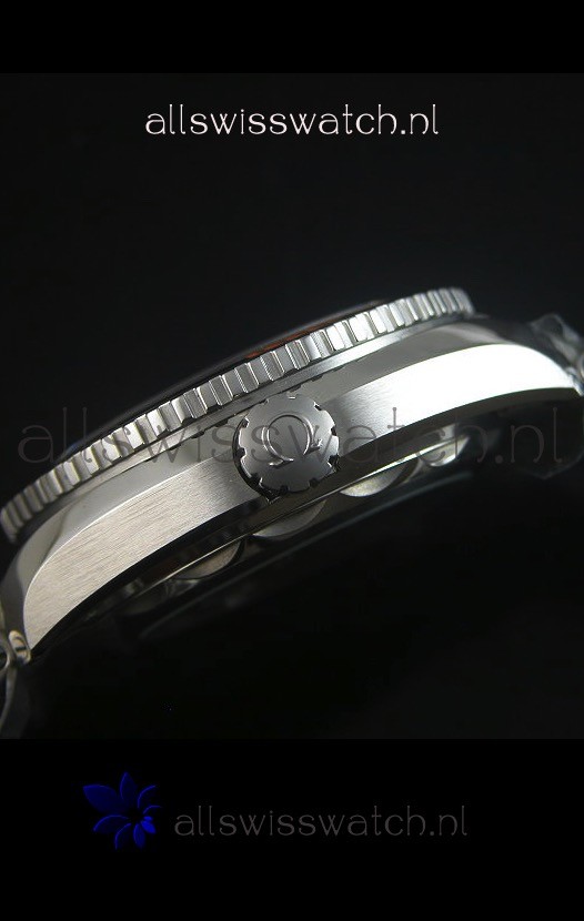 Black Dial and Black Ceramic Inserts Bezel with Orange Highlights.