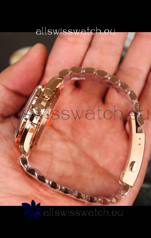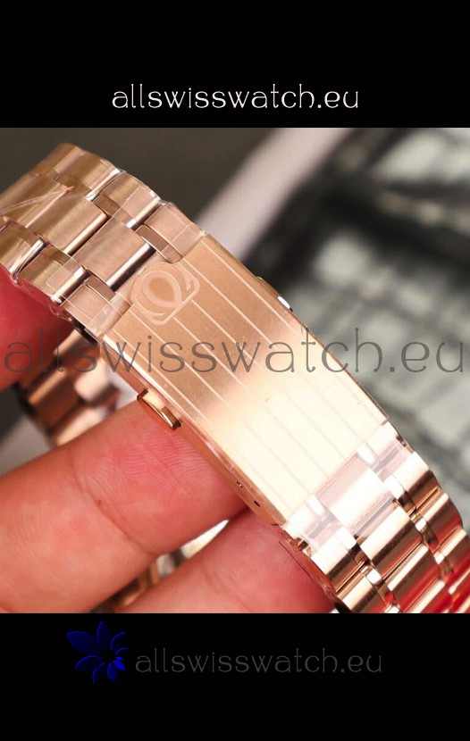 18K Rose Gold Plating on 904L Stainless Steel Strap linked with Screws with Dual Folding Clasps complete with Omega Markings and Engravings