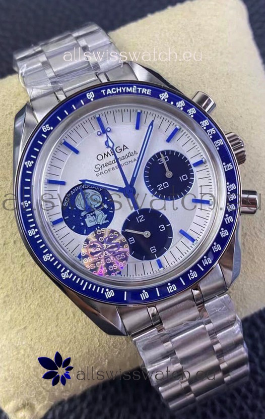Omega Speedmaster Professional Silver Snoopy 50th Anniversary Limited Edition Swiss Replica Watch (Rotating Globe and Snoopy on Rocket Launcher Working Edition)