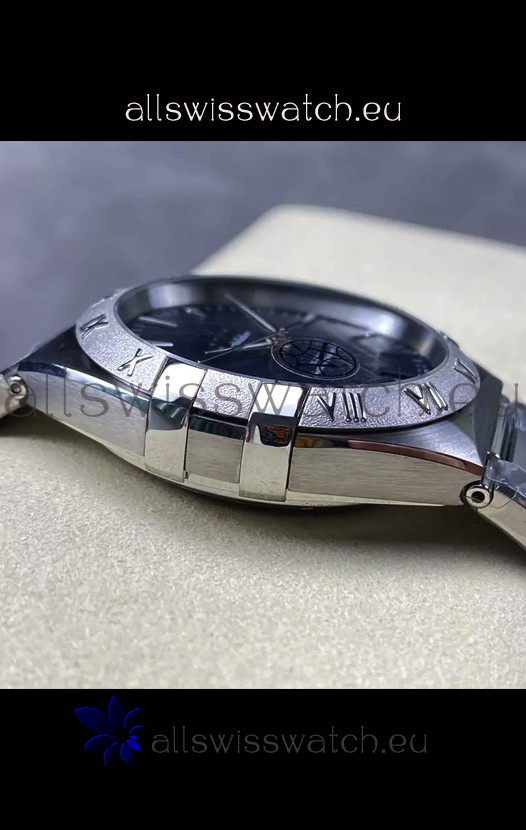 Blue Textured Dial with Steel Hour Markers and Date Window at 3 O'Clock. Long Seconds hands almost touching the Corners as per the Genuine