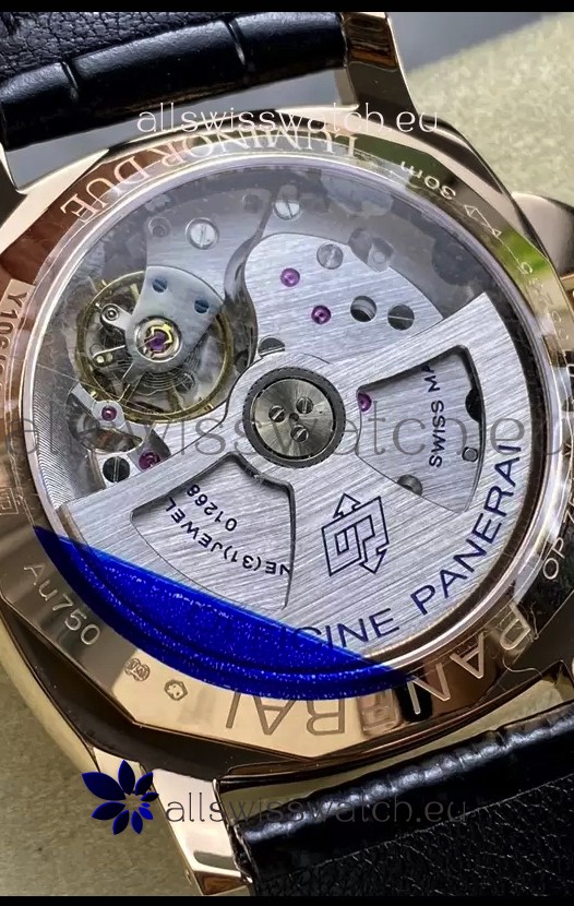 Genuine Swiss Modified 7750 movement Reassembled to resemble the P.9000 Movement. Bridges and Rotor Decorated to resemble the Calibre P.9000 Movement by Panerai