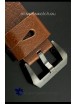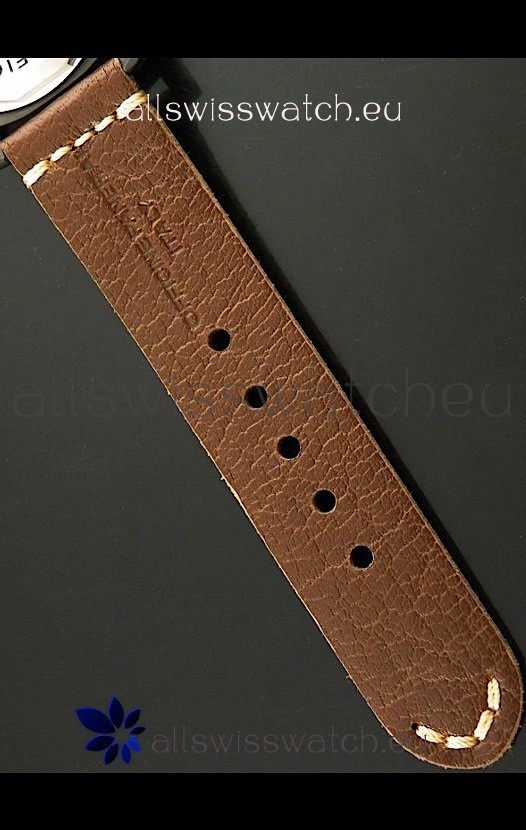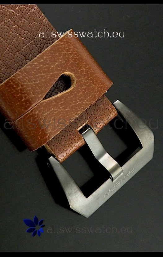 Strap: Dark Brown Leather Strap with Panerai Markings and PVD Coated Tang Buckle