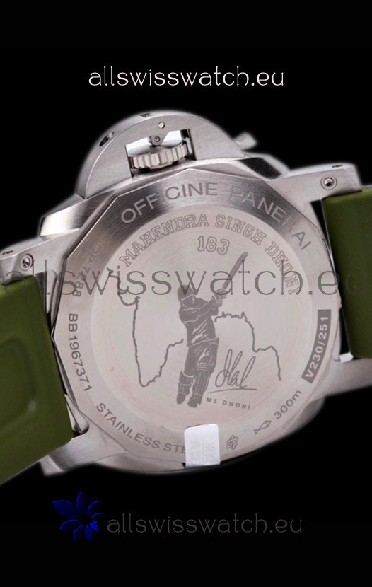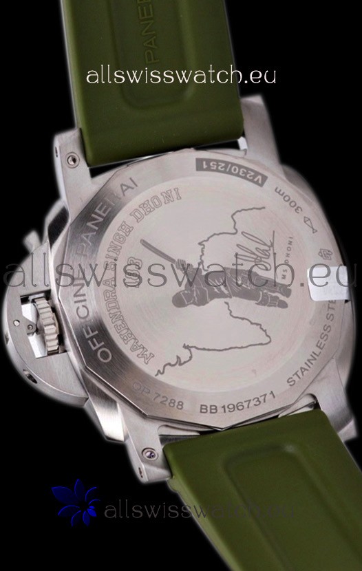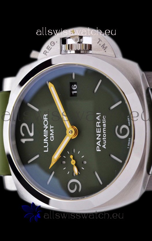 Genuine Green Leather Strap with Steel Tang Buckle complete with Panerai Markings and Engravings.