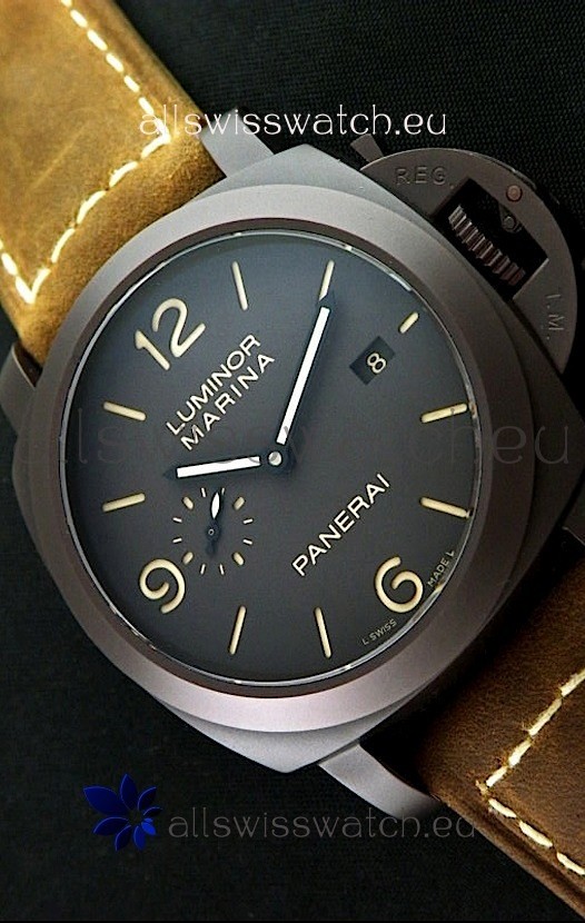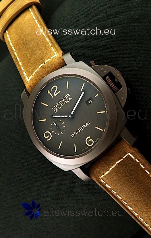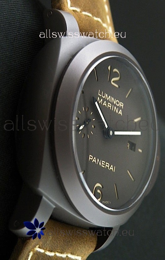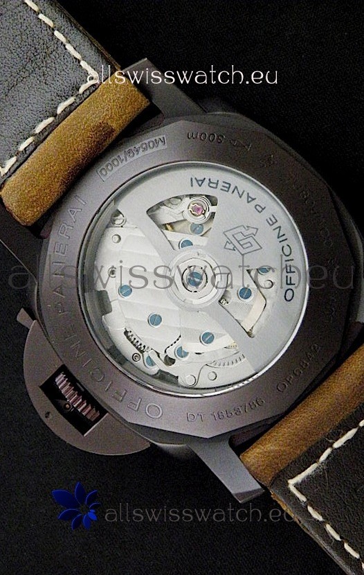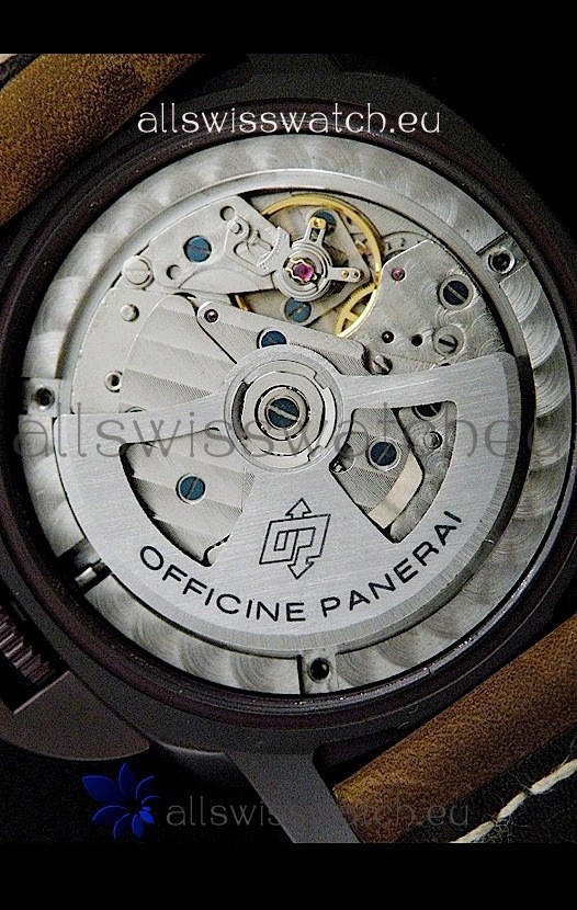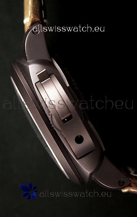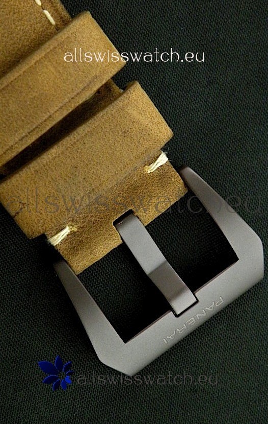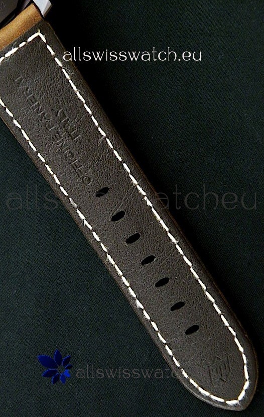 Strap: Genuine Hand Made Leather Strap with Panerai Markings and DLC Coated Tang Buckle