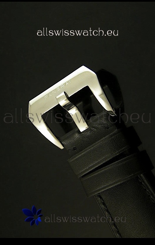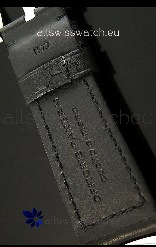 Genuine Black Leather Strap equipped with Stainless Steel V Buckle with Panerai Markings/Engravings.