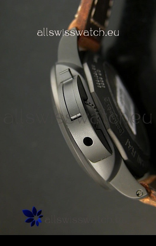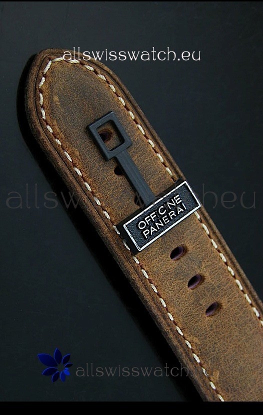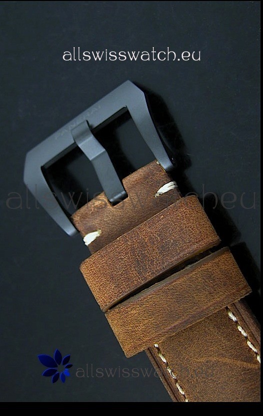 Genuine Leather Strap equipped with Stainless Steel V Buckle with Panerai Markings/Engravings. Flush Lug Screws