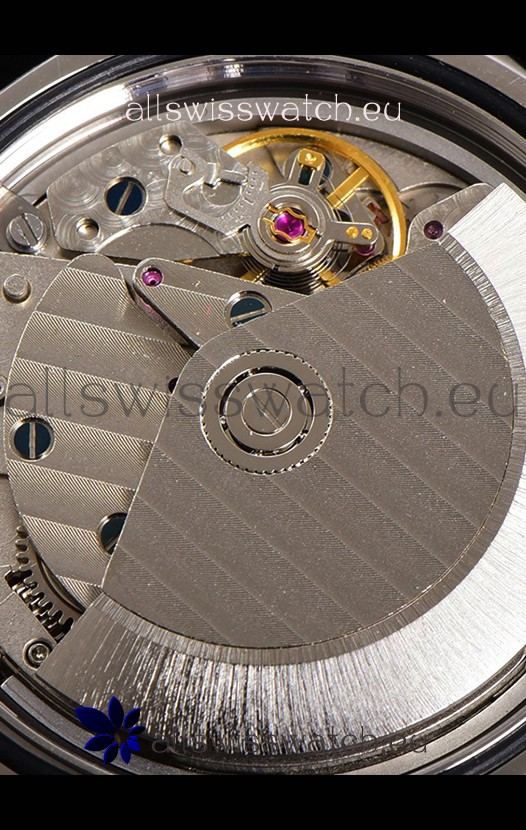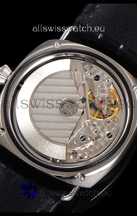 Genuine Swiss Modified 7750 movement Reassembled to resemble the P9010 Movement. Platinum Coated Bridges and Rotor Decorated to resemble the Calibre P900 Movement by Panerai