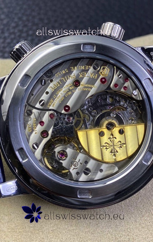 Genuine Swiss 9015 Movement assembled to Resemble the Authentic Patek Philippe PP 240 Calibre Style Movement. Updated Rotor, Bridged and Engravings on Movement with Rose Gold Plated Patek Philippe Stamped Rotor