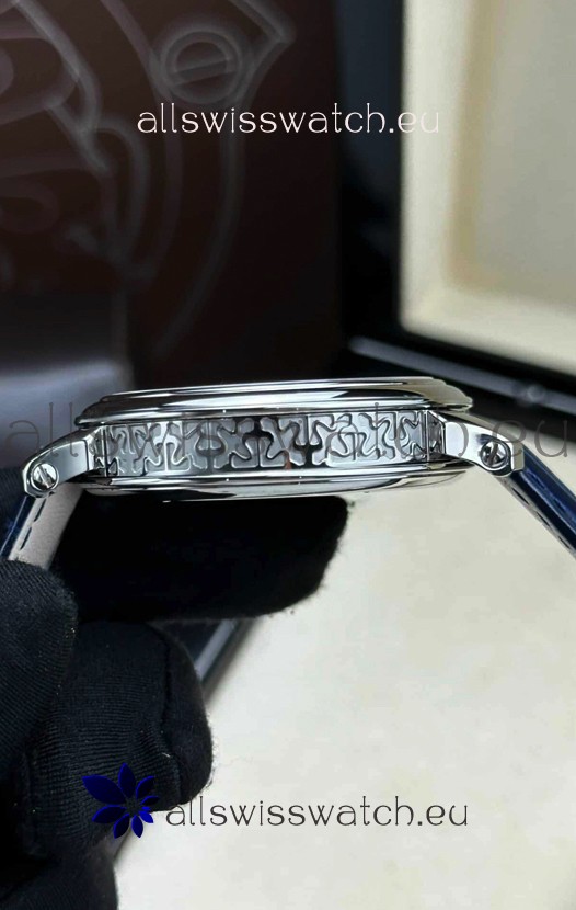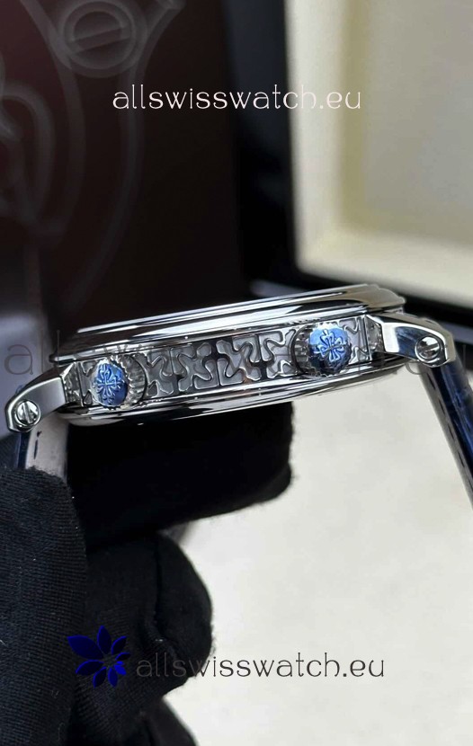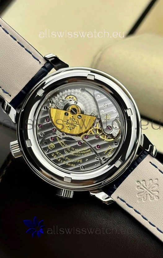 Genuine Swiss 9015 Movement assembled to Resemble the Authentic Patek Philippe PP 324 Calibre Style Movement. Updated Rotor, Bridged and Engravings on Movement with Rose Gold Plated Patek Philippe Stamped Rotor