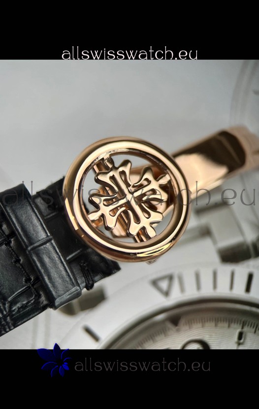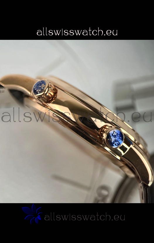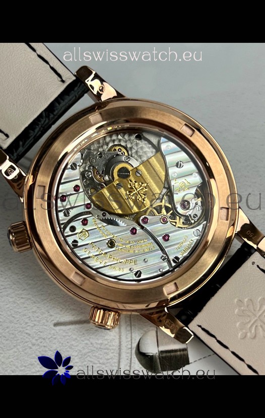 Genuine Swiss 9015 Movement assembled to Resemble the Authentic Patek Philippe PP 324 Calibre Style Movement. Updated Rotor, Bridged and Engravings on Movement with Rose Gold Plated Patek Philippe Stamped Rotor