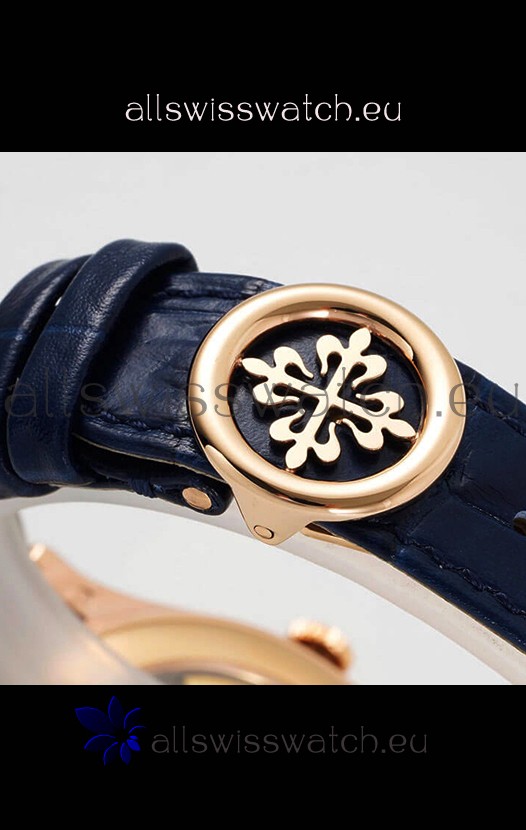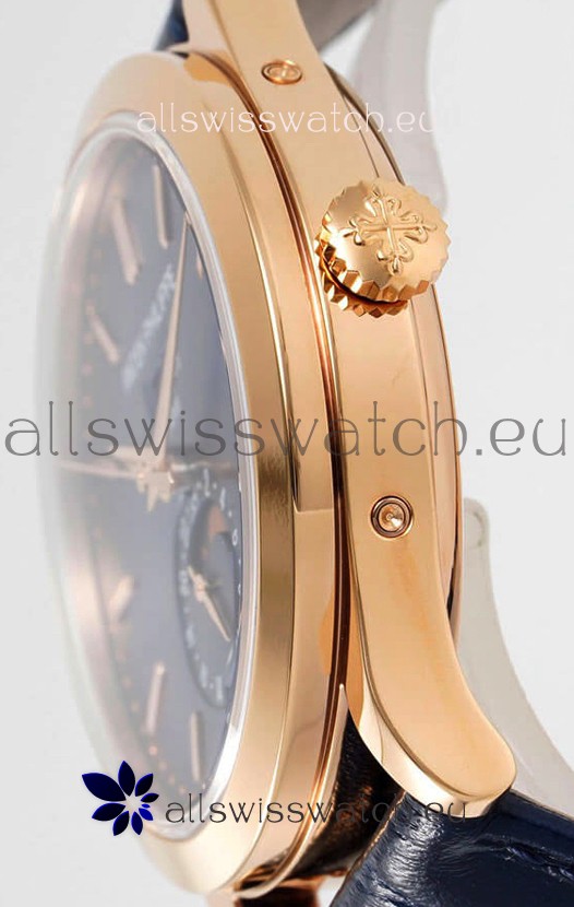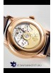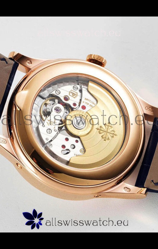 Genuine Swiss 9015 Movement assembled to Resemble the Authentic Patek Philippe PP 240 Calibre Style Movement. Updated Rotor, Bridged and Engravings on Movement with Rose Gold Plated Patek Philippe Stamped Rotor