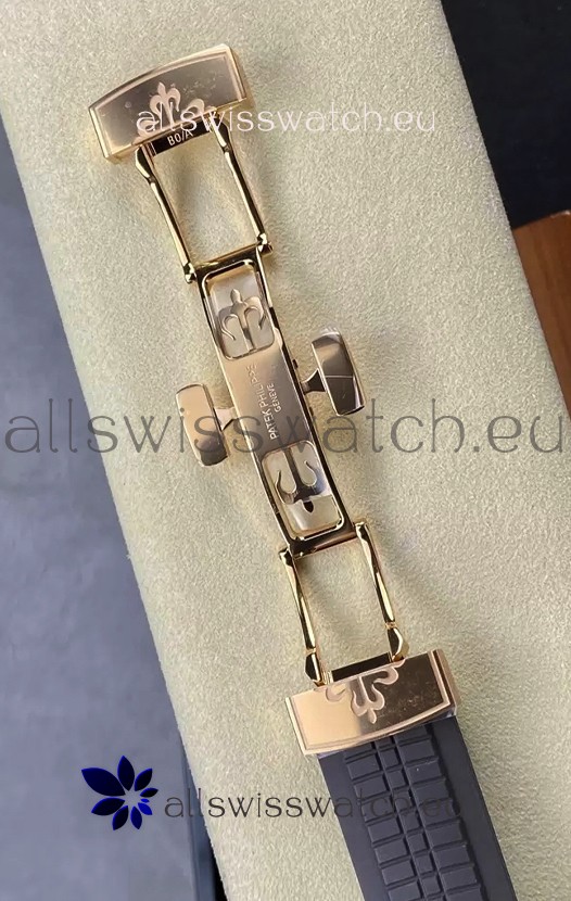 Black Curved Rubber Strap with Rose Gold Plating on Steel Folding Clasp complete with Patek Philippe Markings. A Highly Updated Clasps for this series with much more accurate markings/engravings.