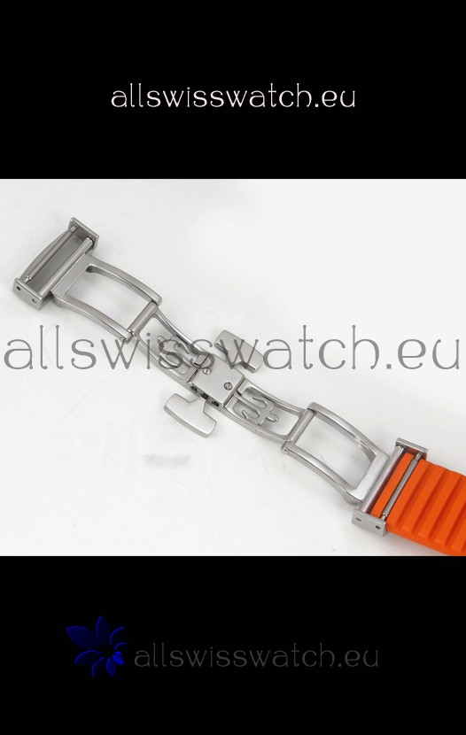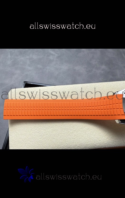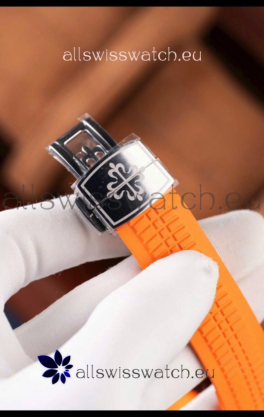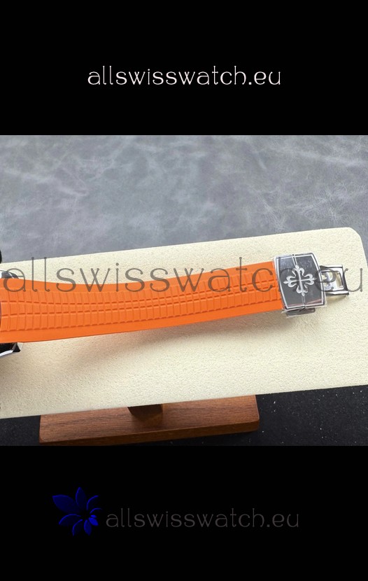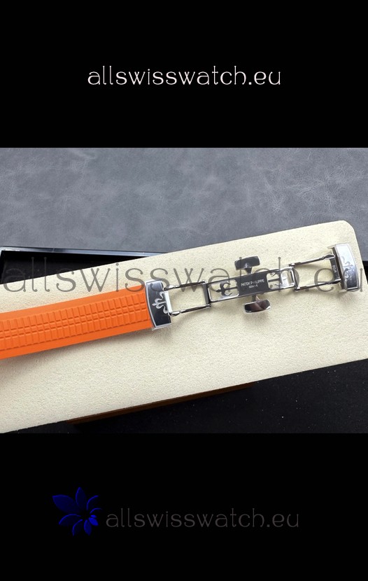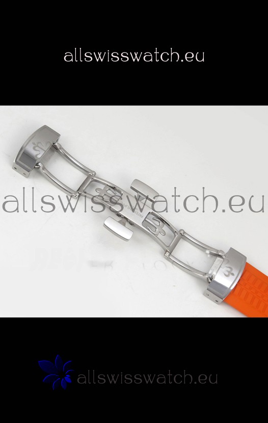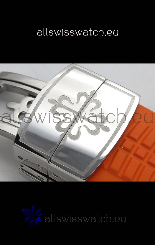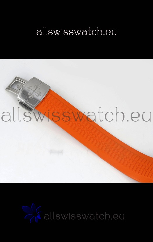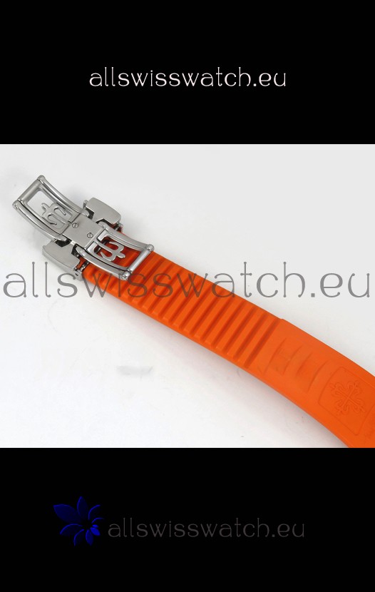 Curved Rubber Strap with Steel Folding Clasp complete with Patek Philippe Markings. A Highly Updated Clasps for this series with much more accurate markings/engravings.