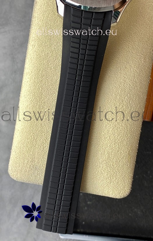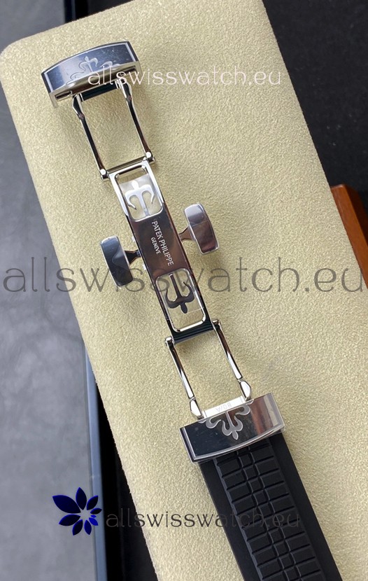 Black Curved Rubber Strap with Steel Folding Clasp complete with Patek Philippe Markings. A Highly Updated Clasps for this series with much more accurate markings/engravings.