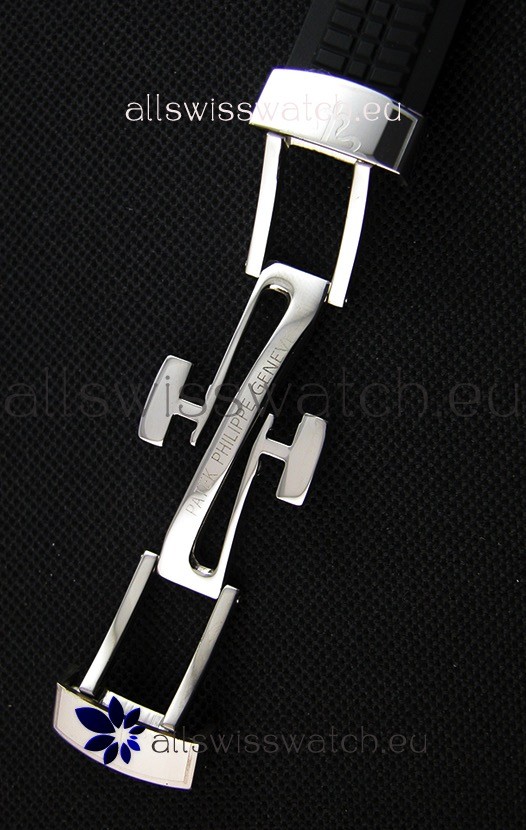 Black New Style Curved Rubber Strap with Steel Folding Clasp complete with Patek Philippe Markings.