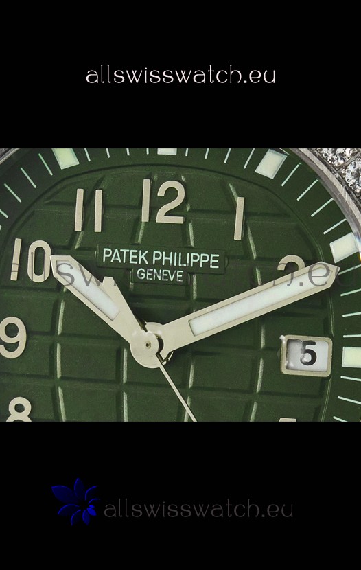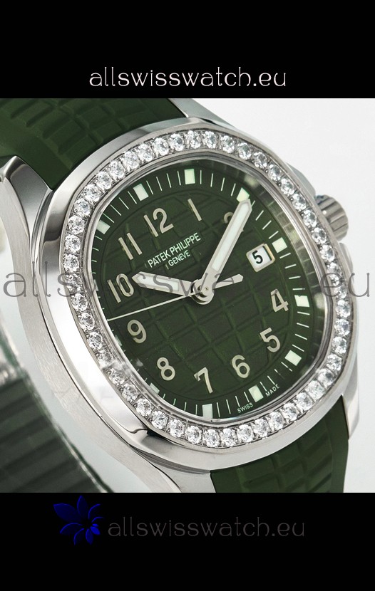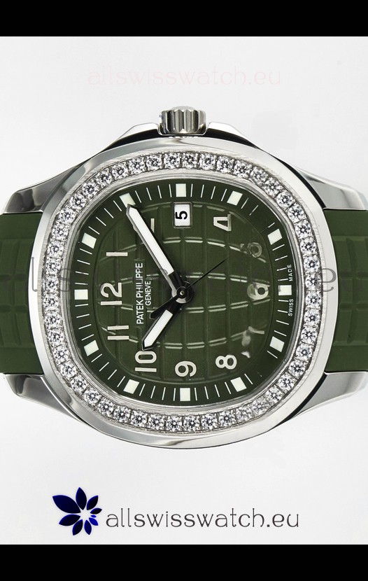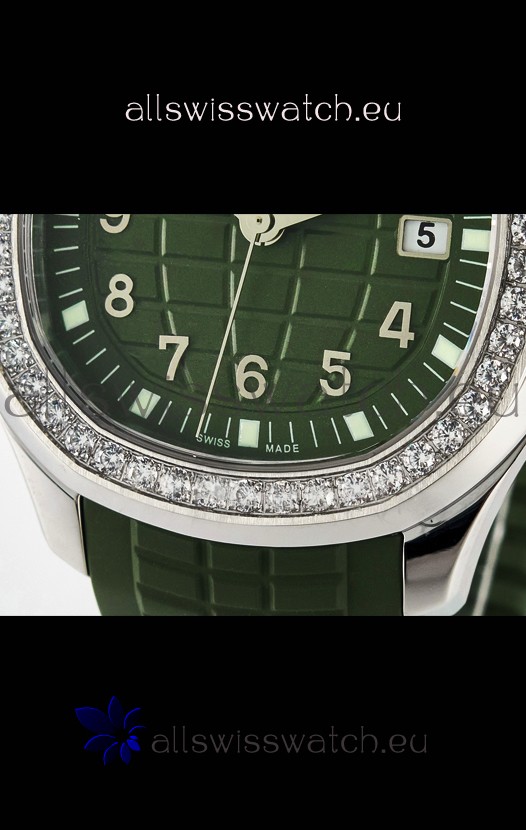 Green Textured Dial with with Date Indicator. Swiss Cut Diamonds Bezel